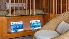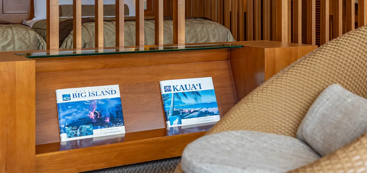 籐製のスタイリッシュな椅子にハワイアンキルトのクッション、天井にはファンがまわり、ハワイ気分が堪能できる。寝室とリビングが続いた94平米の客室は開放感があり居心地抜群。