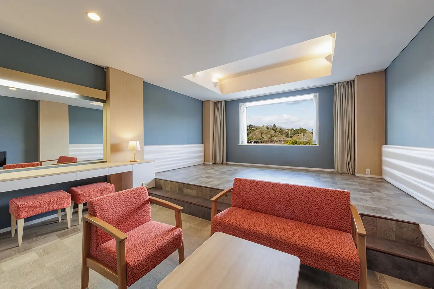 落ち着いたワインレッドと紺色のカラーリングはハワイアンズのホテルの中でも特に、モダンで落ち着いた雰囲気のお部屋です。
